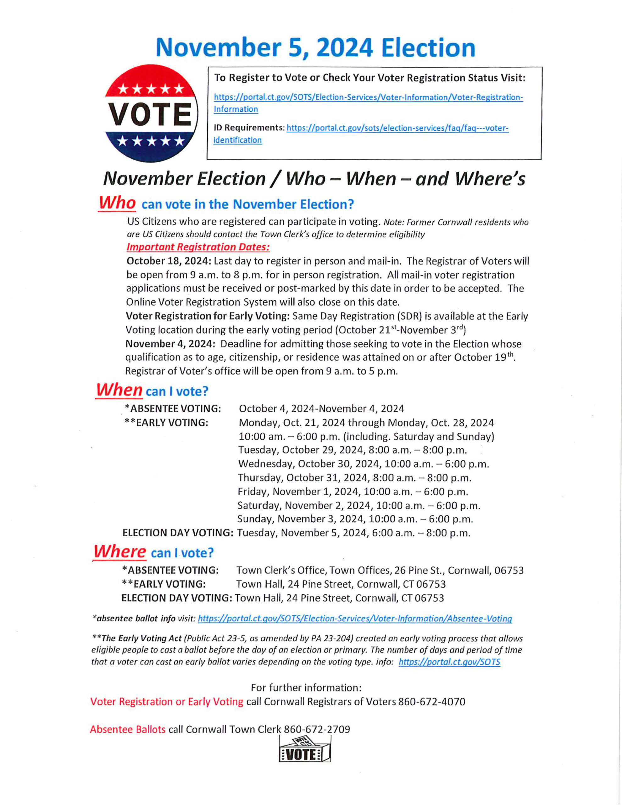 The Electors of the Town of Cornwall are hereby warned to meet at Cornwall Town Hall, 24 Pine Street, Cornwall, CT, on Tuesday, November 5, 2024, for the following purposes: