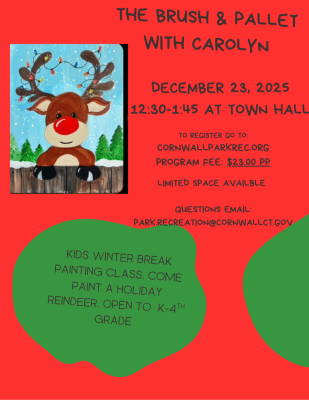 Reindeer Canvas painting class with Carolyn from the Brush and Pallet, Located at the town hall from 12:30-1:45, $23 sign up on cornwallparkrec.org