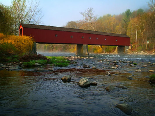 The community of West Cornwall is home to one of the last covered bridges in Connecticut. Measuring 172 feet long and 15 feet wide, the West Cornwall Covered Bridge (which carries vehicle traffic over the Housatonic River on Connecticut Route 128) is listed on the National Register of Historic Places and has been a symbol of the area’s rural heritage for almost 160 years.